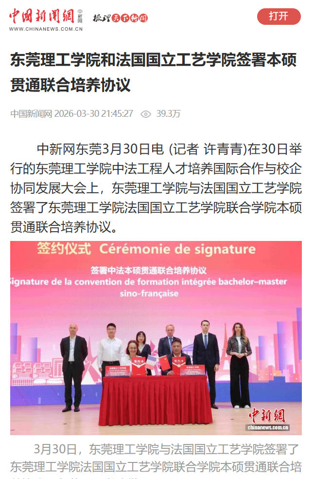 3月30日,东莞理工学院与法国国立工艺学院签署了东莞理工学院法国国立工艺学院联合学院本硕贯通联合培养协议。东莞理工学院供图 据了解,法国国立工艺学院是直属于法国国民教育部的国立高等学府,成立于1794年,具有悠久的高级工程技术人才培养和科学研究传统。2017年6月16日,东莞理工学院法国国立工艺学院联合学院正式揭牌成立。