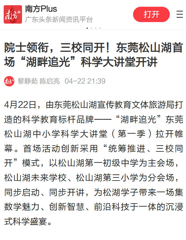 “湖畔追光”东莞松山湖中小学科学大讲堂(第一季)精彩持续,后续还将邀请中国散裂中子源科学中心副主任童欣、松山湖材料实验室研究员袁冶、自然资源部自然资源首席科学传播专家徐世球等顶尖科学名家陆续走进校园,带来半导体科技、地球探秘、大国重器、中子科学等松山湖独有的特色科普内容,持续为青少年送上高品质科学“大餐”。