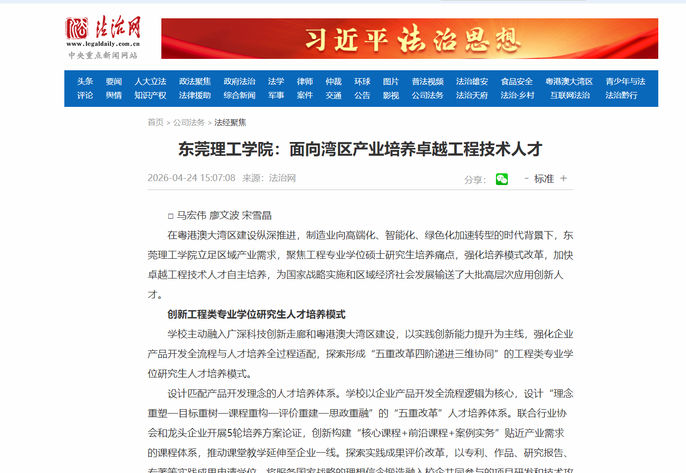 在粤港澳大湾区建设纵深推进,制造业向高端化、智能化、绿色化加速转型的时代背景下,东莞理工学院立足区域产业需求,聚焦工程专业学位硕士研究生培养痛点,强化培养模式改革,加快卓越工程技术人才自主培养,为国家战略实施和区域经济社会发展输送了大批高层次应用创新人才。