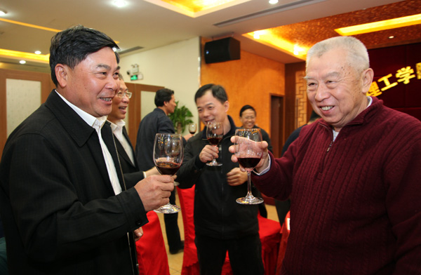 周致纳率校领导班子向老同志祝酒,祝愿老同志在新的一年里身体健康、生活愉快。