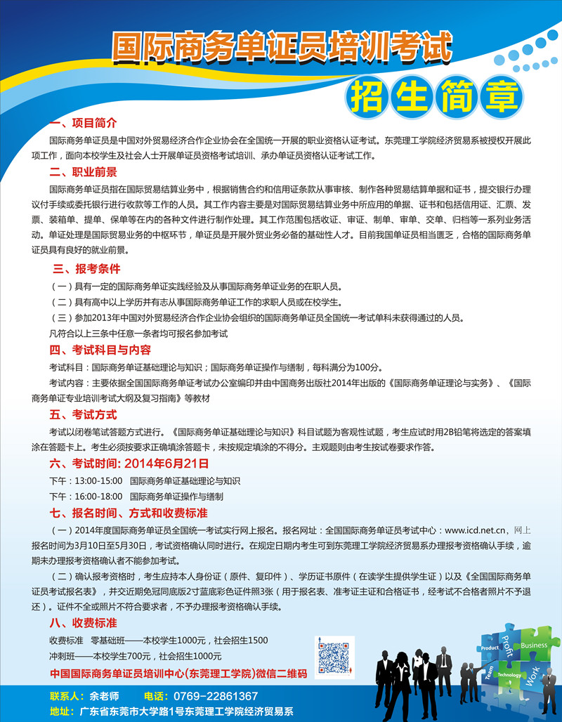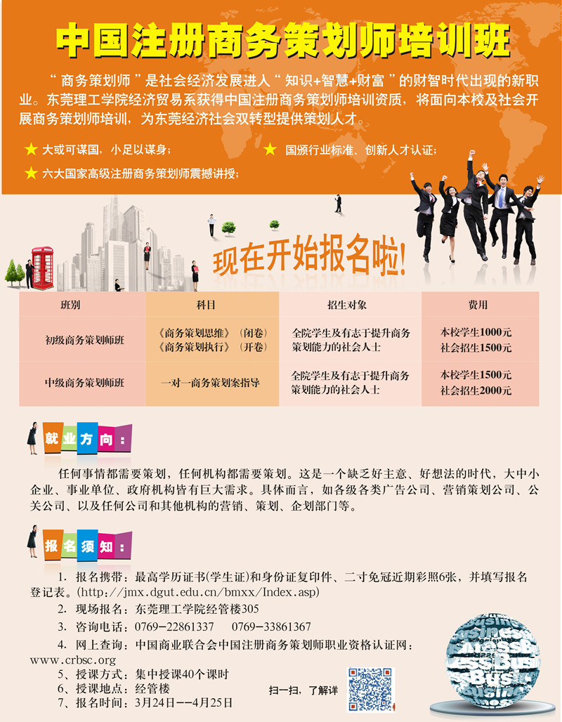 为深入贯彻落实学校第二次党代会精神,抢抓机遇,以协同创新为引领,立足社会实际,经济贸易系积极探索新途径,经过精心筹备,获得中国注册商务策划师培训资质及国际商务单证员培训资质。现面向本校及社会正式开始招生。
