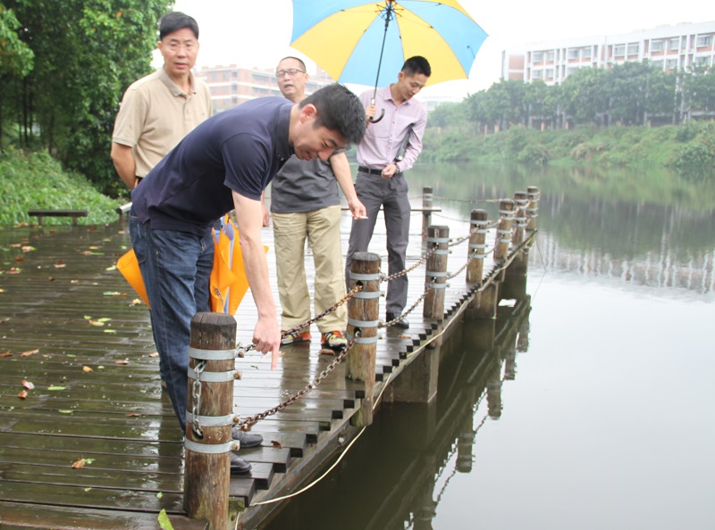 检查组重点检查了靠近二期饭堂、电子楼、学术交流中心的几处山体,“情人桥”附近水体,人行道的遮雨棚,电子楼地下架空层,主干道下水道井盖,施工工地等容易发生安全事故的地方。相关部门负责人进行了现场办公,提出了整改要求:尽快清理遮雨棚顶的枯枝落叶,减轻负重;在电子楼地下架空层加装防盗门、防盗网;改建“情人桥”护栏并在沿岸配置救生圈;在容易冲开的下水道井口加装防坠网;完善施工工地排污管道,加固围墙栏;加强临时工简易居住棚的消防安全措施等,以确保校园安全。