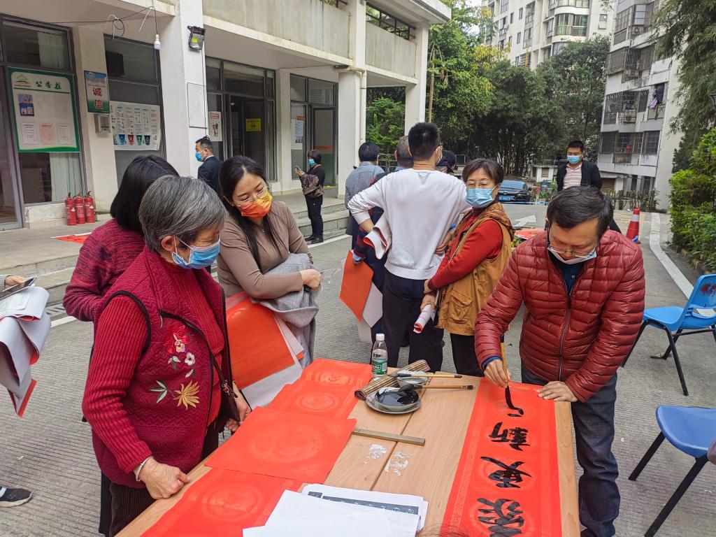 1月15日,“挥毫写春意,泼墨送祝福”送春联活动在教师村业主活动中心前空地举行。校教职工书画协会杨万江、宋跃、莫振轩、陈礼明四位老师现场挥毫,为大家书写虎年春联,送去最真挚的祝福。现场氛围喜气洋洋,拿到春联的老师面上洋溢着欢乐的笑容。
