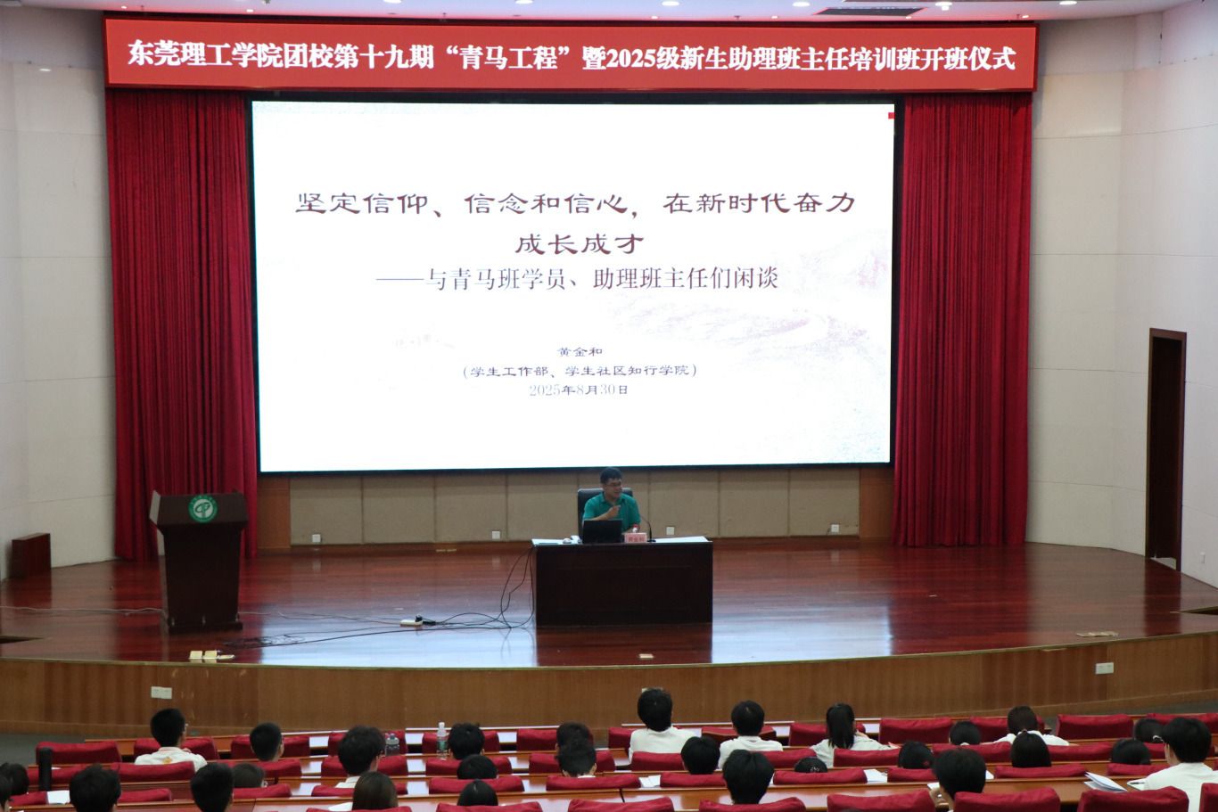 在理论授课环节,学生工作部部长黄金和围绕“坚定信念,在莞工申博更大的新征程上奋力书写挺膺担当的青春篇章”主题,结合朋辈育人典型案例,深入浅出地阐述了学生骨干在学校高质量发展中的使命担当。