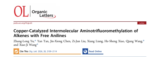 2月,我校松山湖医工融合创新中心、化学工程与能源技术学院王晓季教授团队在有机化学TOP期刊Organic Letters上在线发表题为Copper-Catalyzed Intermolecular Aminotrifluoromethylation of Alkenes with Free Anilines的最新研究成果。化学工程能源与技术学院青年教师鱼章龙博士为论文的第一作者,东莞理工学院为论文的第一单位,研究得到国家自然科学基金,粤莞区域联合基金等多个项目的资助。
